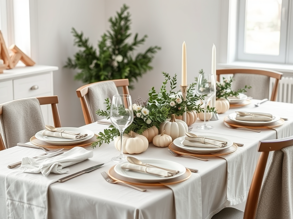 For those who love a clean, simple look, a minimalist Scandinavian tablescape is a beautiful choice. With a focus on whites, grays, and greenery, this style brings calm elegance and works especially well for smaller gatherings.