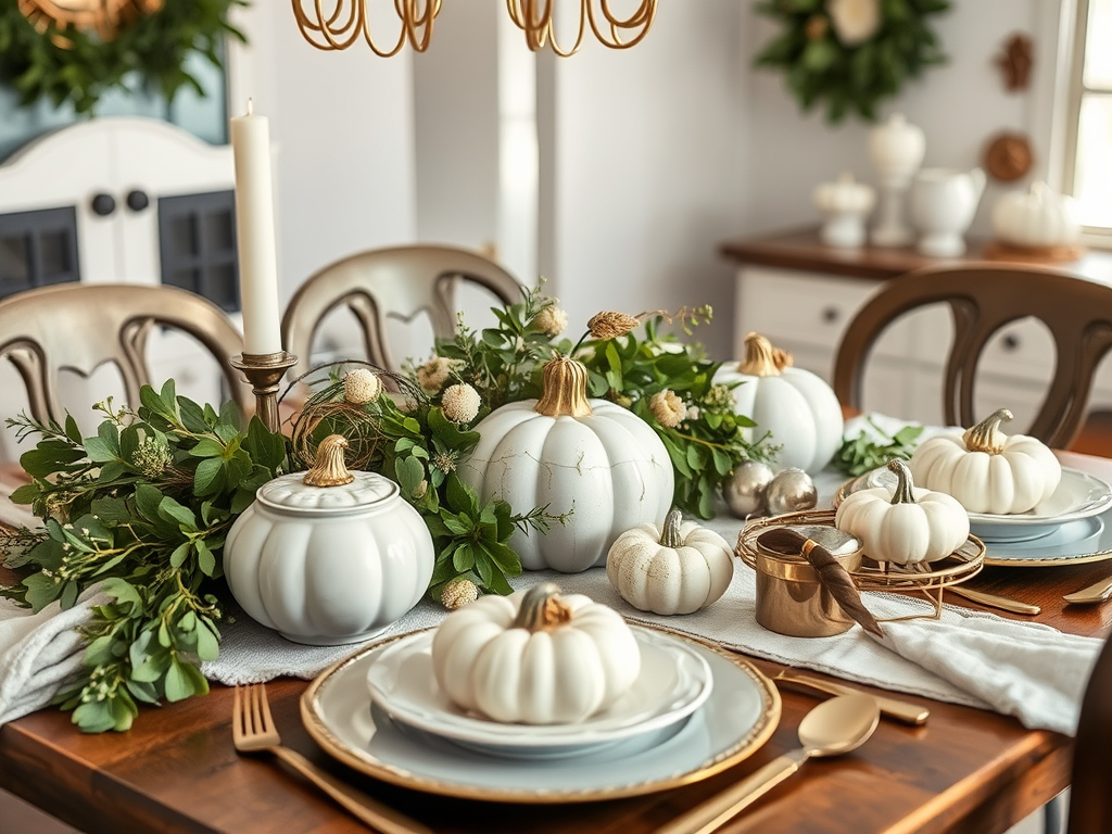 Combine farmhouse charm with elegant touches for a sophisticated yet cozy Thanksgiving tablescape. This style pairs white and gold accents with lush greenery and textured fabrics to bring a touch of elegance to your holiday table.